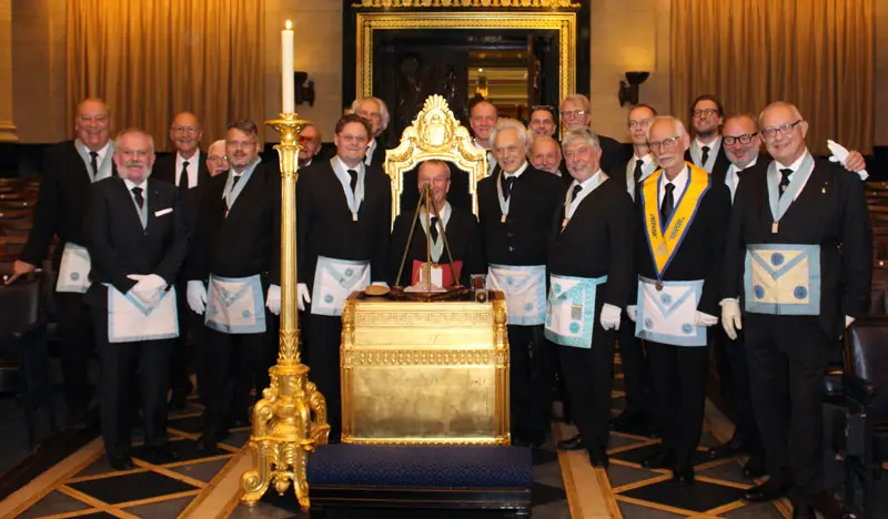 The meeting was graced by the presence of R.W. Bro. Warren Duke, Metropolitan Grand Master, who attended as the Guest of Honour. He was accompanied by a senior delegation from Vienna, led by the Grand Secretary of the Grand Lodge of Austria, R.W. Bro. Franz Bauer. They were joined by Masters and Brethren from across the full spectrum of AFLA member Lodges, creating a sea of diverse regalia within the Temple. Following the labour in the Temple, the celebration continued with a “White Table” Festive Board held in the magnificent surroundings of the Grand Temple Vestibule.